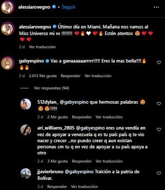Todo inició hace dos días, luego de que Gaby Espino dejara un comentario en el perfil de Instagram de la representante inca en el citado concurso, Alessia Rovegno, de 24 años de edad. En esa publicación, la modelo anunciaba su partida hacia Nueva Orleans, donde se celebrará la gala de belleza.